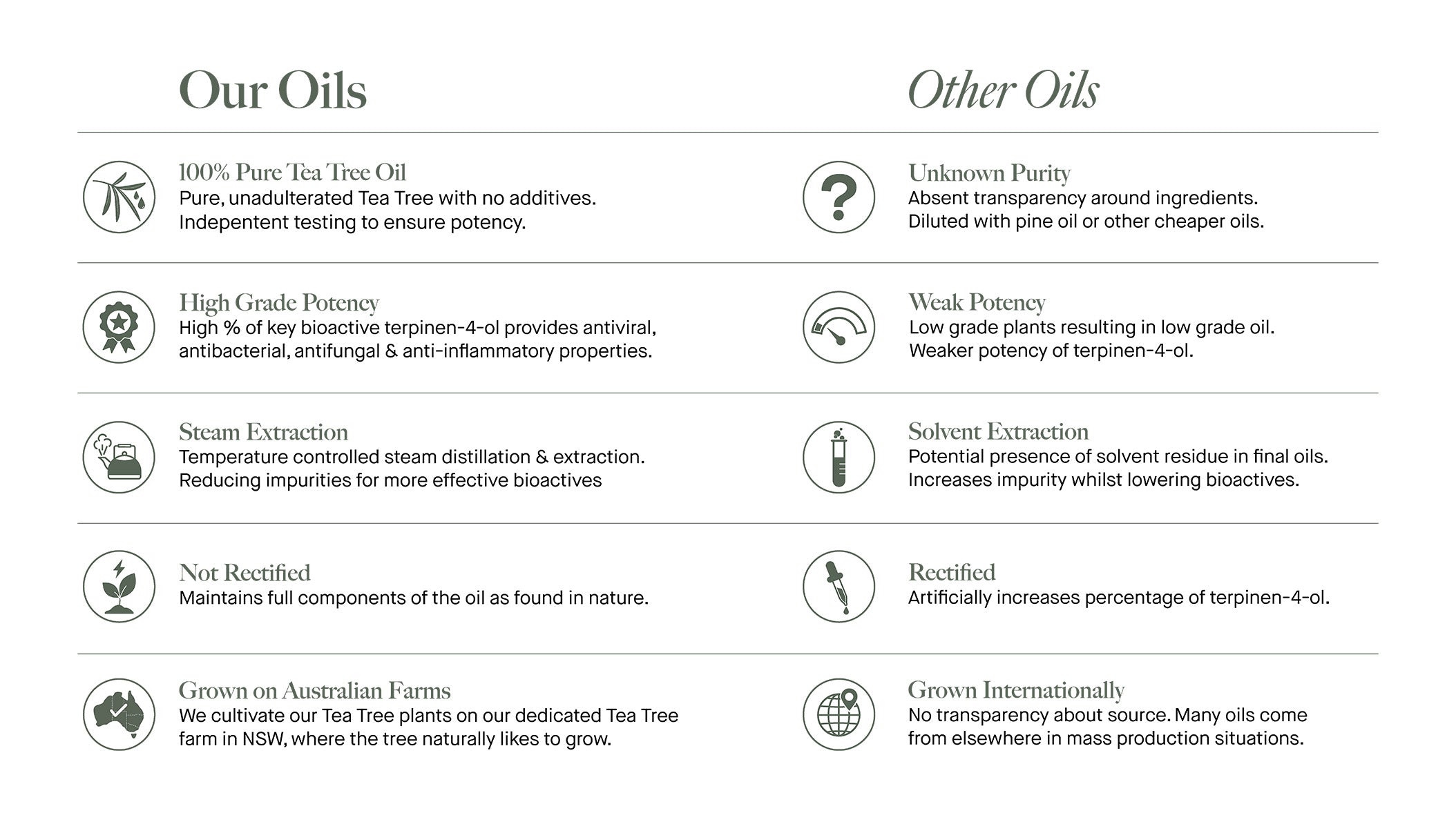 Our Tea Tree & Blue Mallee Eucalyptus oils are pure and unadulterated. We grow, steam distil & bottle all our products in Australia. Learn more about our Complete Transparency