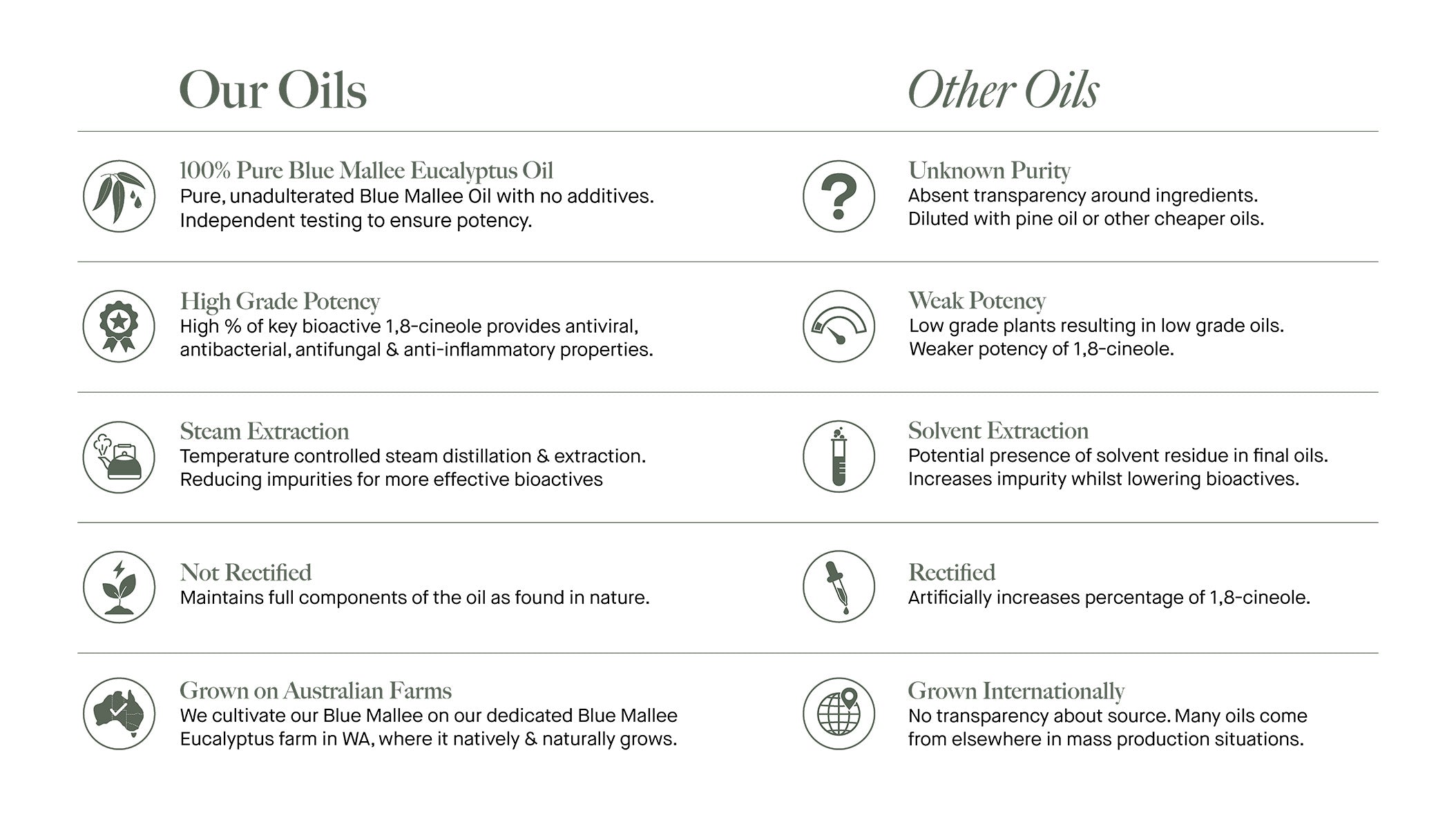Our Tea Tree & Blue Mallee Eucalyptus oils are pure and unadulterated. We grow, steam distil & bottle all our products in Australia. Learn more about our Complete Transparency