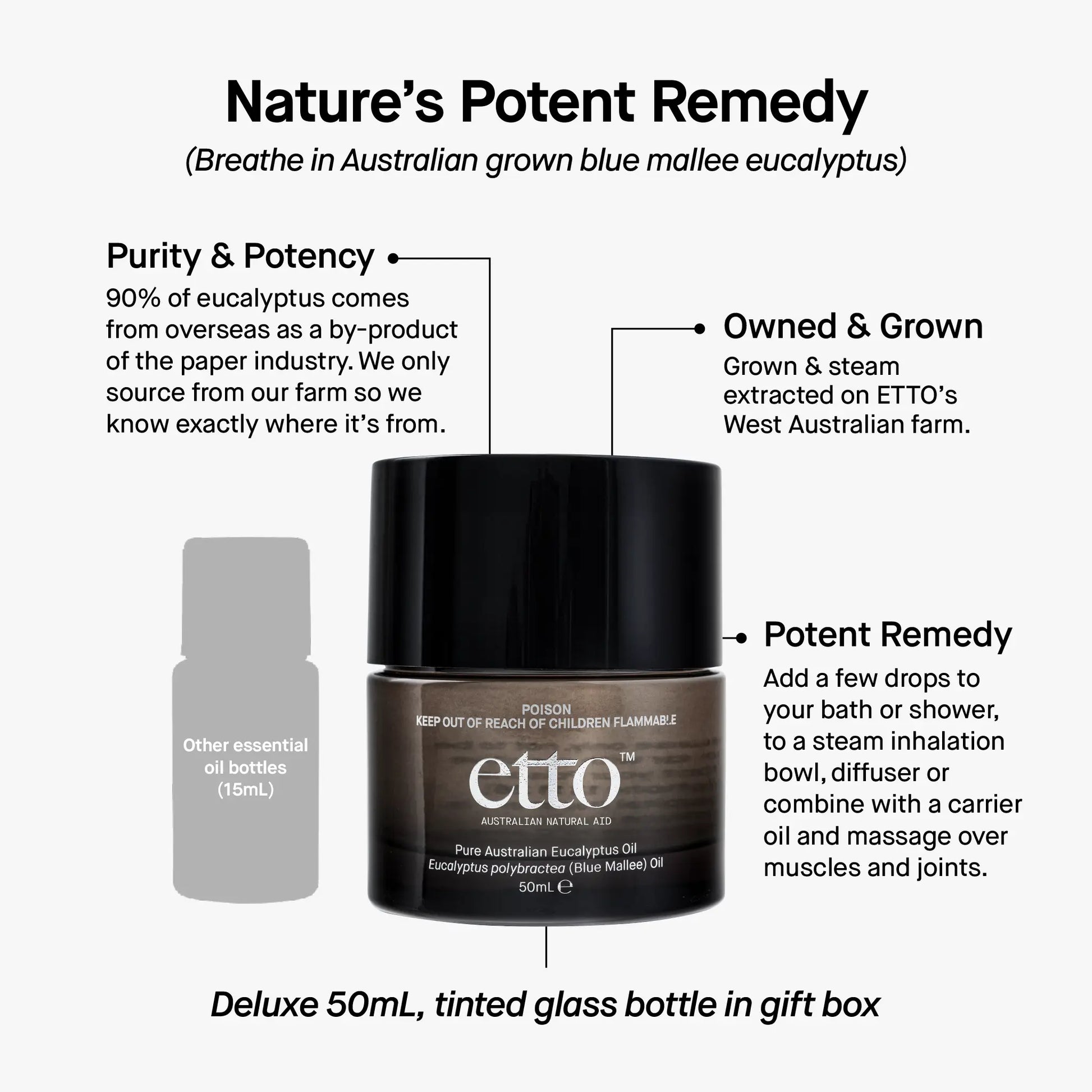 ETTO’s Blue Mallee Eucalyptus Oil is a pure, potent and multipurpose essential oil known for its exceptionally high cineole content. With its fresh, invigorating scent and natural remedial benefits, this is a 100% pure oil.