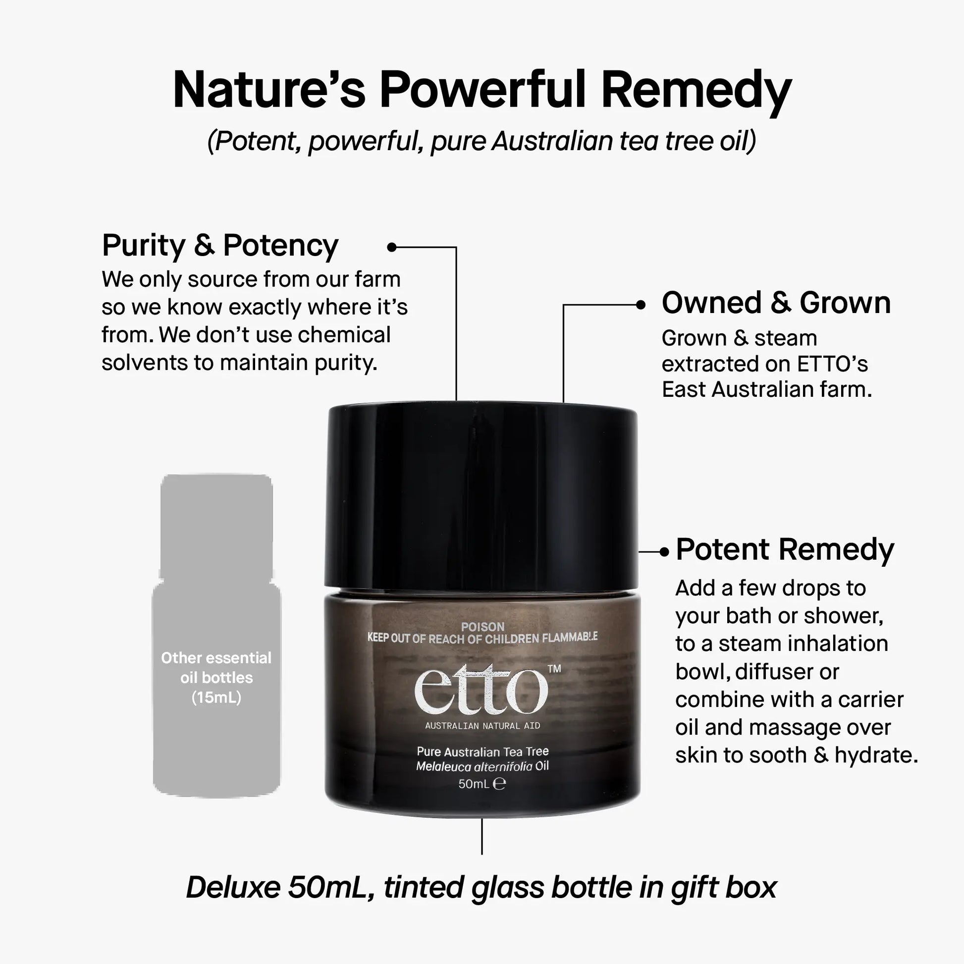 Harvested from ETTO’s Australian farm, this oil contains a high concentration of terpinen-4-ol – the key bioactive component responsible for its effectiveness.