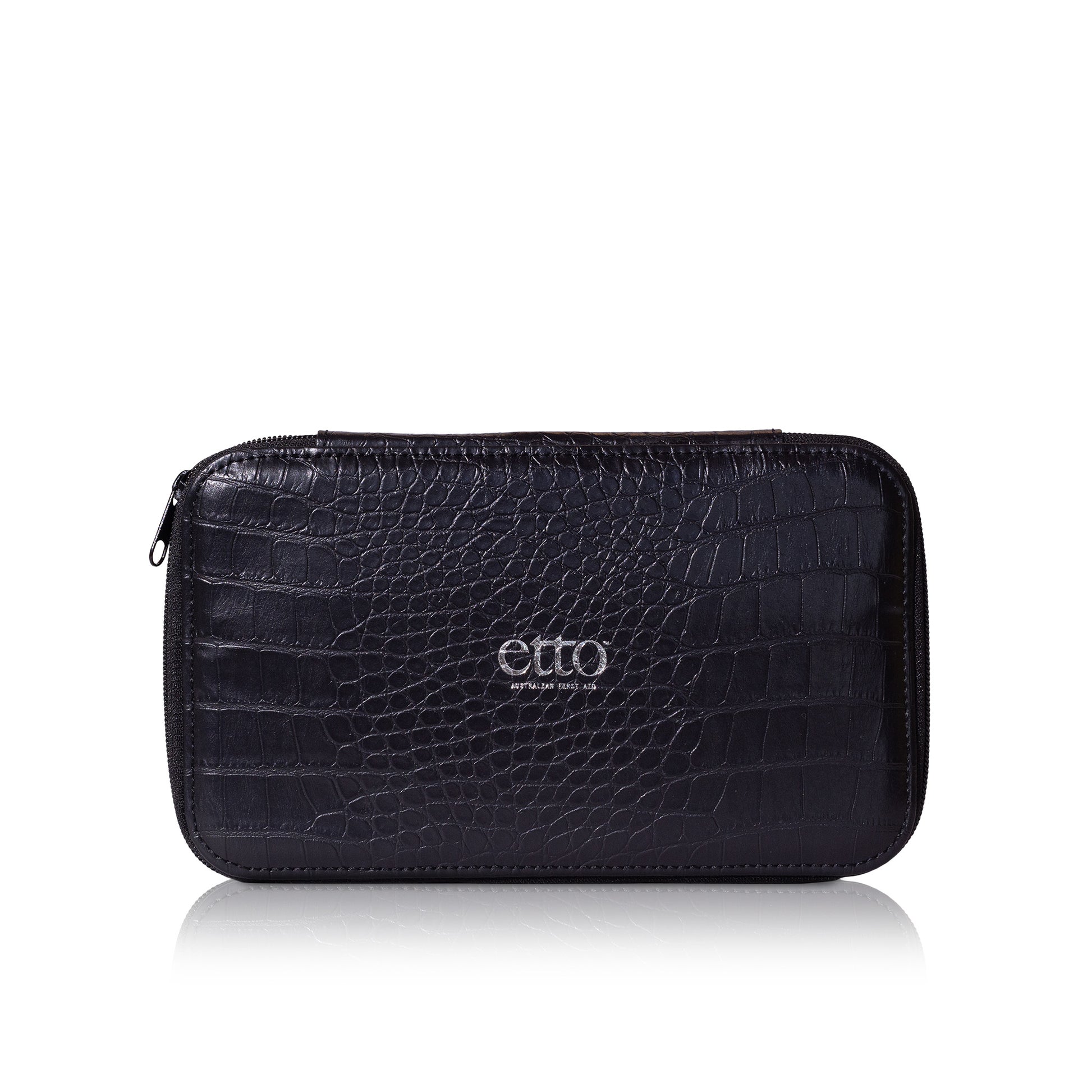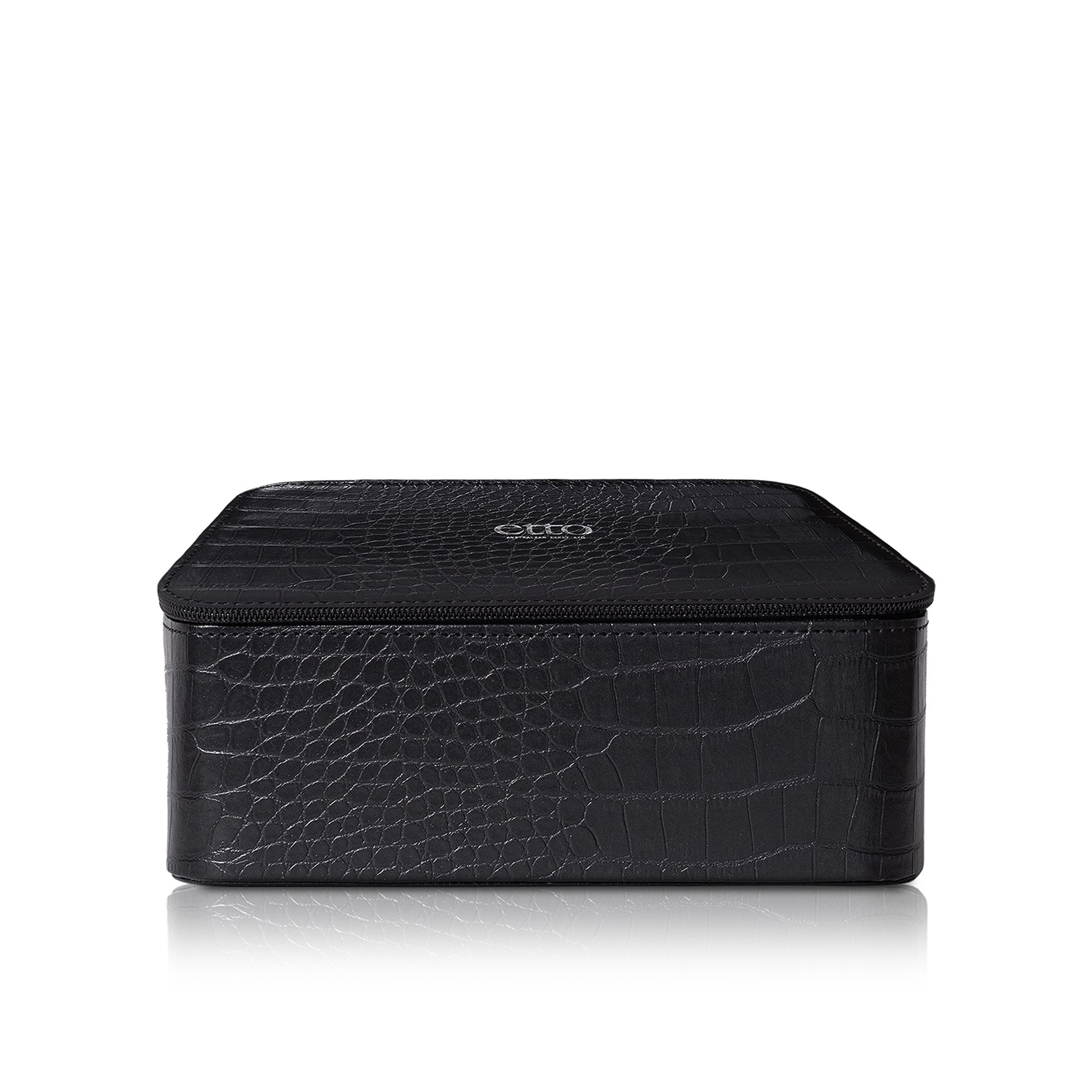 Multipurpose box made from black crocodile embossed vegan leather adorned with the ETTO silver signature. Lined in silky smooth black oxford linen.